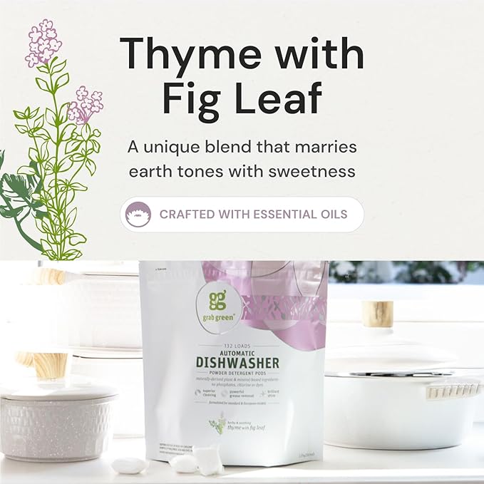 Grab Green Automatic Dishwashing Detergent Pods, 24 Count, Thyme Fig Leaf Scent, Plant and Mineral Based, Superior Cleaning, Powerful Grease Removal,