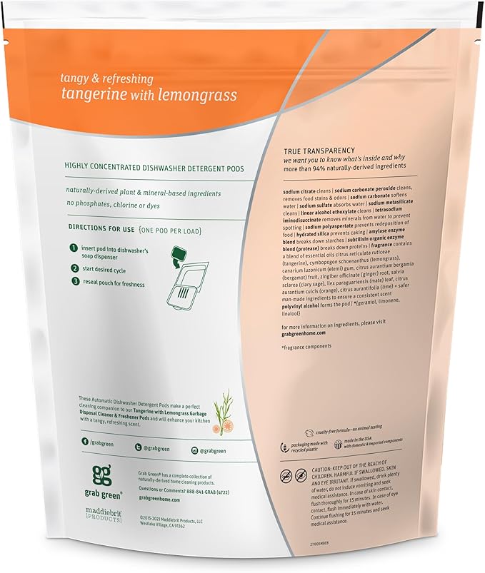 • Contains: 1- 60 Pod Bag of Grab Green Natural Tangerine with Lemongrass Automatic Dishwashing Detergent Pods. Our velcro closure bags are convenient and easy to use, no hassling with frustrating zip closures