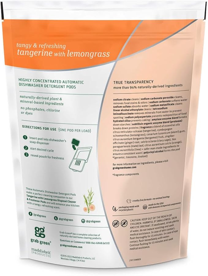 • Contains: 1- 24 Pod Bag of Grab Green Natural Tangerine with Lemongrass Automatic Dishwashing Detergent Pods. Our velcro closure bags are convenient and easy to use, no hassling with frustrating zip closures