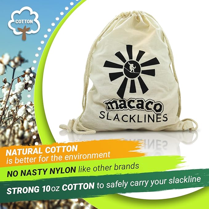 • Natural Cotton Carry Bag - All outside toys need a carry bag and ours are made from natural cotton which is better for the environment, outdoor fun and why macaco slacklines are used for forest school equipment.