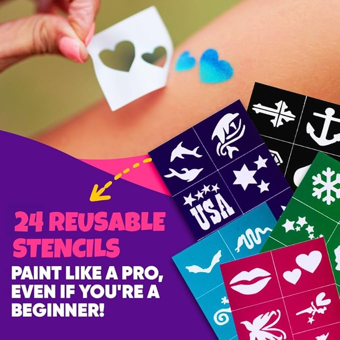 • 🎨 π—–π—’π— π—£π—Ÿπ—˜π—§π—˜ π—™π—”π—–π—˜ π—£π—”π—œπ—‘π—§ π—žπ—œπ—§: Unleash creativity with 28 vibrant color face painting kit for kids, 24 reusable stencils, 100 gem stickers, 2 body glitter pots, 3 brushes, 4 sponges, & a 16-design booklet & bonus rainbow split cake - fun for the whole family! A fun Halloween face paint kit with stencils and Halloween face paint kit for adults. Please note: Packaging may vary