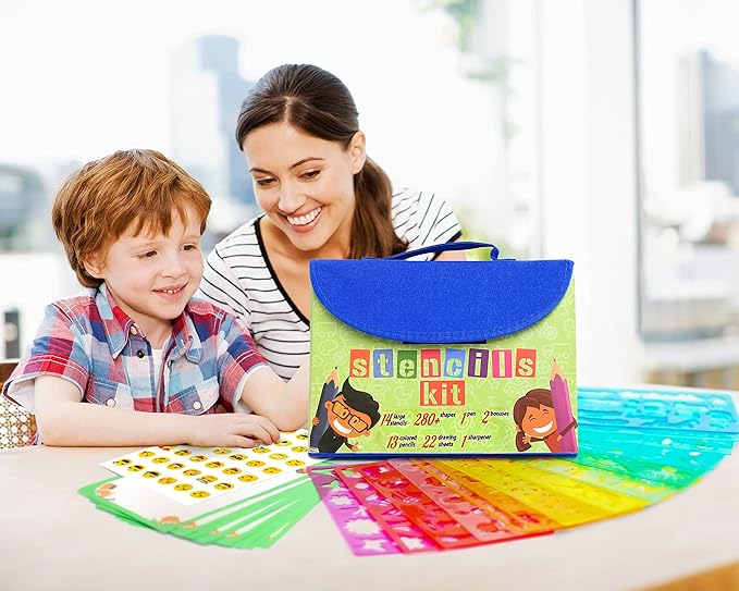 • Complete Drawing Stencils Kit for Kids: Surprise your toddler and kids with a big stencil kit for their art projects! This 55-piece set is complete with papers, colored pencils, sticker sheet, and more!