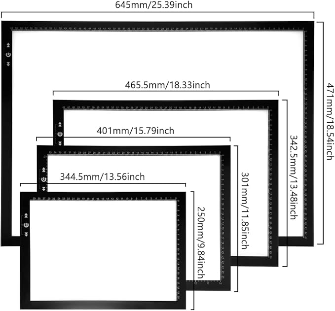 • Easy Carrying -- A4 Size Super Slim Trace Drawing light box with 0.23’’ Aluminum Frame is Sturdy, Light Guide Board make The illumination is perfectly even, super bright, and flicker-free, Overall dimension including Black Frame: 13.56”x 9.84”, Visual area: 12” x 8.27”