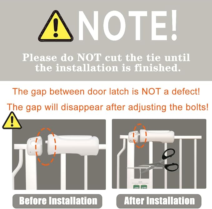 • EASY INSTALLATION: Pressure mounted gate is quick to set up and uninstall in 5 minutes without additional hardware or tools. 4 spindle rods let you adjust top and bottom independently. NOTE: a gap between the gate latch and the frame is NOT a defect NOR bent. Please do not cut the elastic rope until the gate lines up with the latch successfully and becomes secure
