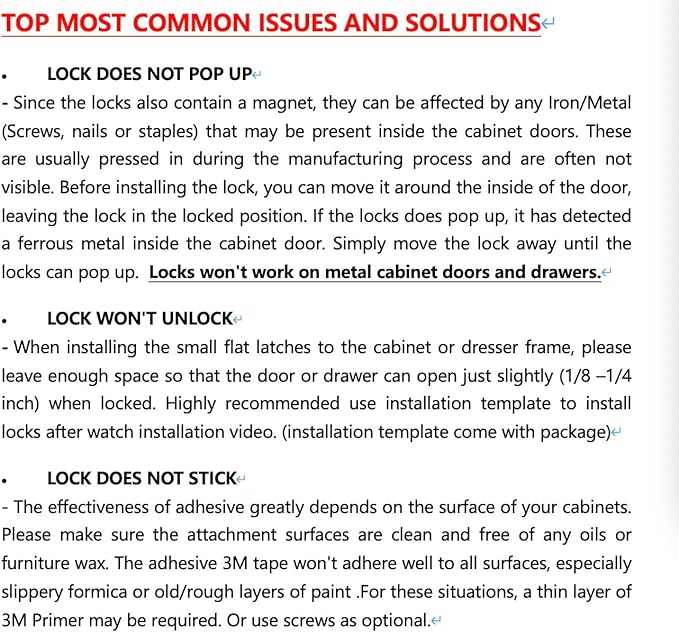 • [ INSTALLATION TIPS] The locks can be affected by any Iron/Metal (Screws, nails or staples) that may be present inside the cabinet doors, and not visible. Before installing the lock with the adhesive, move it around the inside of the door, leaving the lock in the locked position. If the locks does not pop up, it has detected a ferrous metal inside the cabinet door. Simply move the lock away until the locks can pop up, and install the lock in that position.