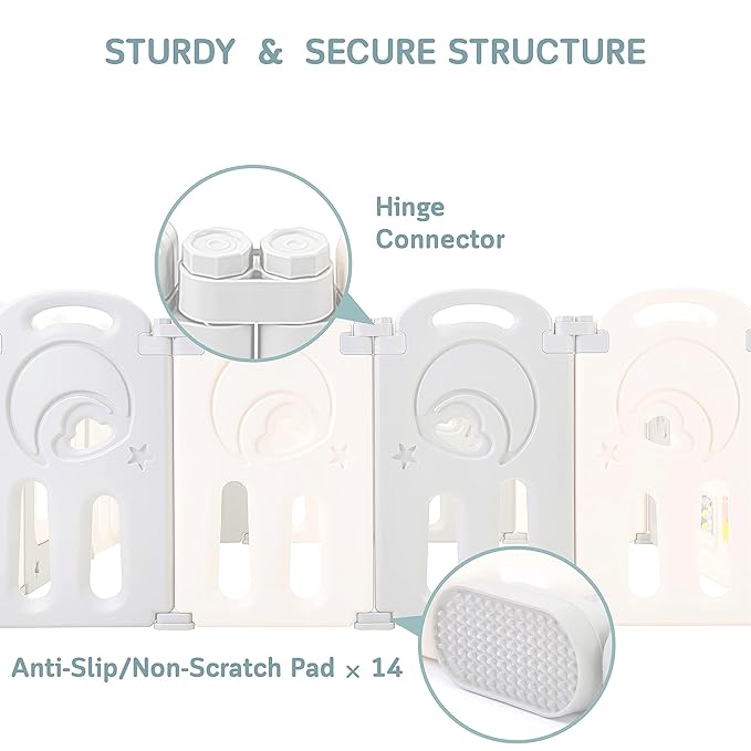 • STURDY & SECURE: Keeps the baby fence's shape and position thanks to its strong hinge connectors and anti-slip pads; includes a gate with safety lock that allows convenient access and secures your baby inside.