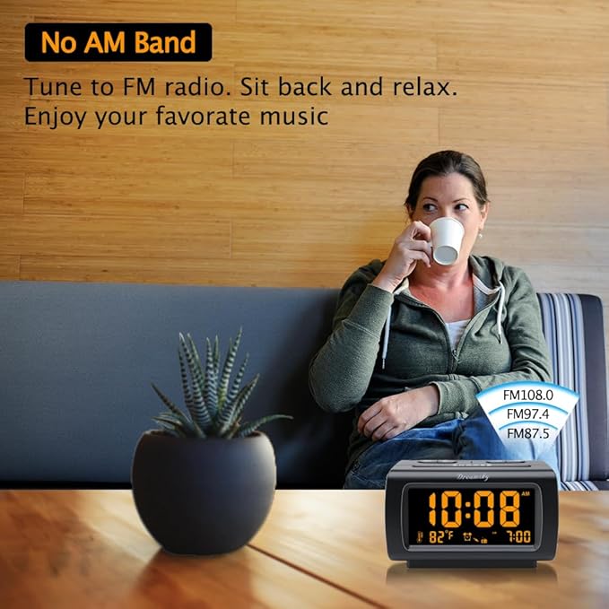 • Electric Digital Alarm Clock with Full Range Dimmer: 4 Inches large LCD screen with eye easy catch orange number display, time and content are easy to read at a glance. 100%-0% completely adjustable display brightness for comfortable viewing. 12 or 24hr switch, Indoor temperature ( ℃ or ℉) Display.
