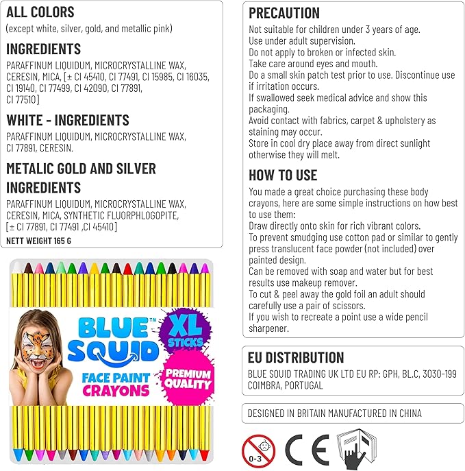 • 🌈 π—¨π—‘π—Ÿπ—’π—–π—ž 𝗬𝗒𝗨π—₯ π—žπ—œπ——'𝗦 𝗖π—₯π—˜π—”π—§π—œπ—©π—œπ—§π—¬ - Blue Squid face paint crayons offers versatile tools for your child's artistic expression, suitable for a wide range of activities including school events and theatrical performances. As a Blue Squid customer, you'll get instant access to an exciting free bonus - an online kids facepainting ideas guide with step-by-step videos that show you how to whip up fantastic face paint designs!