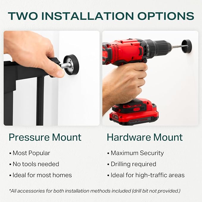 • Two Installation Options: Our gate features two convenient installation options: pressure mounting and hardware installation. Pressure mounting allows for quick installation in just 10 minutes without any tools, providing a secure fit that won't damage walls. It's perfect for hallways and doorways and can withstand impacts of up to 150 Lbs for enhanced safety. Hardware installation offers maximum stability for high-traffic areas like staircases, preventing movement. It can endure impacts exceeding 210 Lbs without sustaining damage, making this gate a reliable choice for various environments.