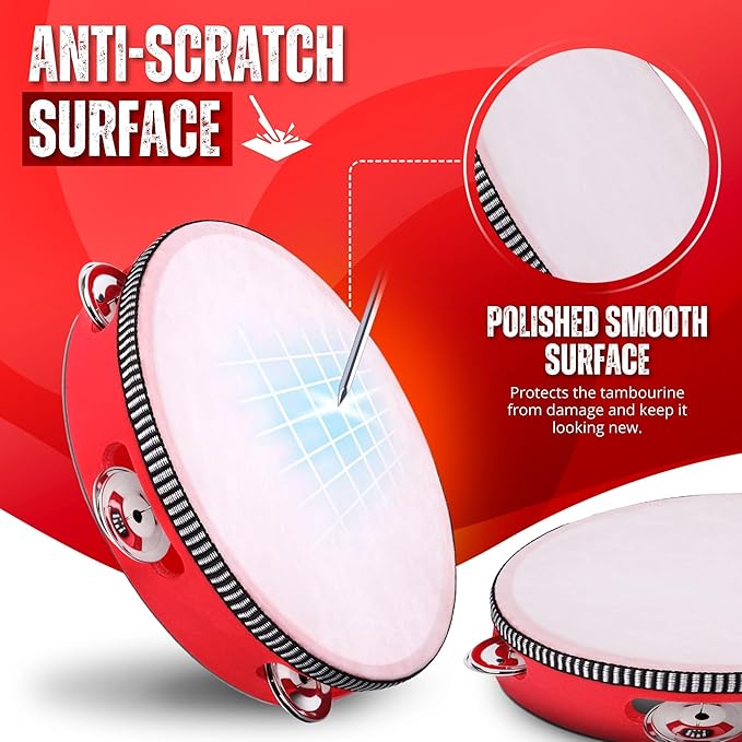 • Elevate your Music: Our tambourines for adults and kids have 8 pairs of single-row metal jingles that produce a crisp, clear sound; the tambourine is one of the musical instruments that adds depth and complexity to your music