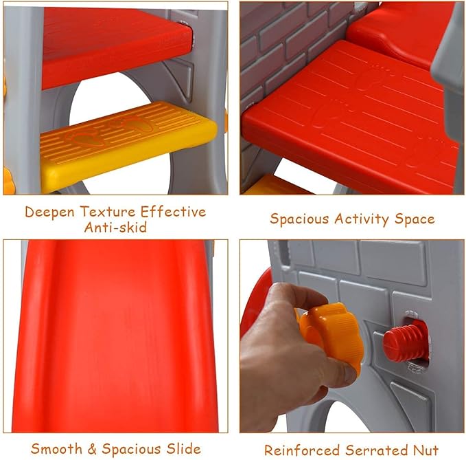 • 【Easy to Assemble & Clean】 The children's castle slide can be assembled quickly, saving you time and effort. It can bring fun for kids right away. And use serrated nuts for reinforcement to prevent loosening. Smooth surface is easy to clean and maintain. You can easily wipe off the stain with a damp rag.
