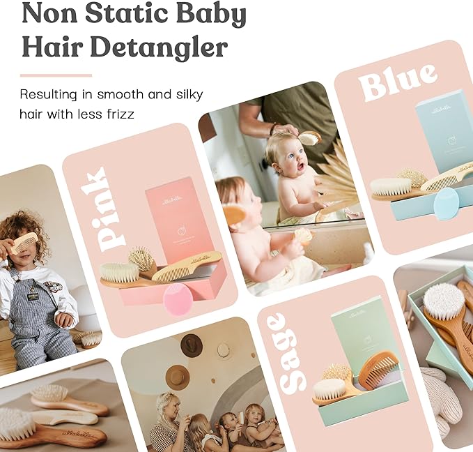 • WOODEN BRUSH AND COMB SET! This baby hair brush set for newborns includes four baby grooming accessories, a soft wooden goat hair brush for baby, a sturdy wooden detangler brush for longer hair, a wooden bristle comb for the toddler age, and a silicone scrubber brush for removing cradle cap. Our product grows with your little one from age 0 to 5!