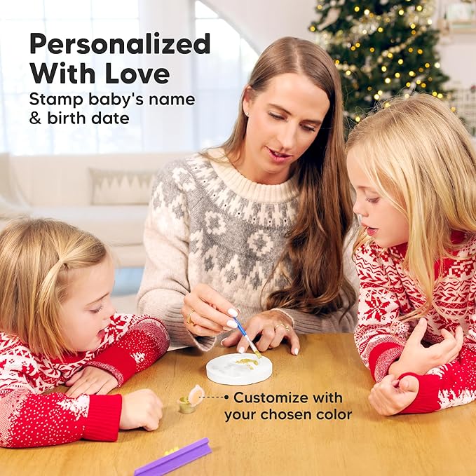 • Personalized Baby Print Ornament Maker - This baby clay handprint kit comes with bonus acrylic paint, paint brush, 6 satin ribbons, 2 twig strings and alphabet stamps. Create a special and memorable baby's first Christmas ornament for your little one!