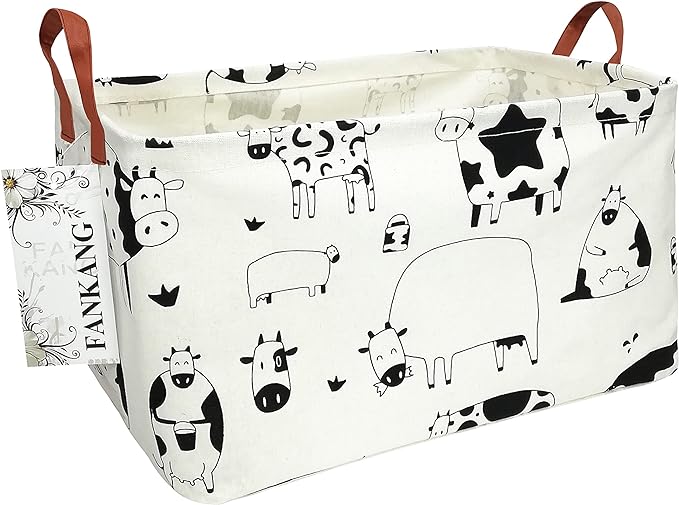 FANKANG Storage Basket,Nursery Hamper Canvas Laundry Basket Foldable with Waterproof PE Coating Storage, Office, Bedroom, Clothes,Toys(L, Rec-cows)