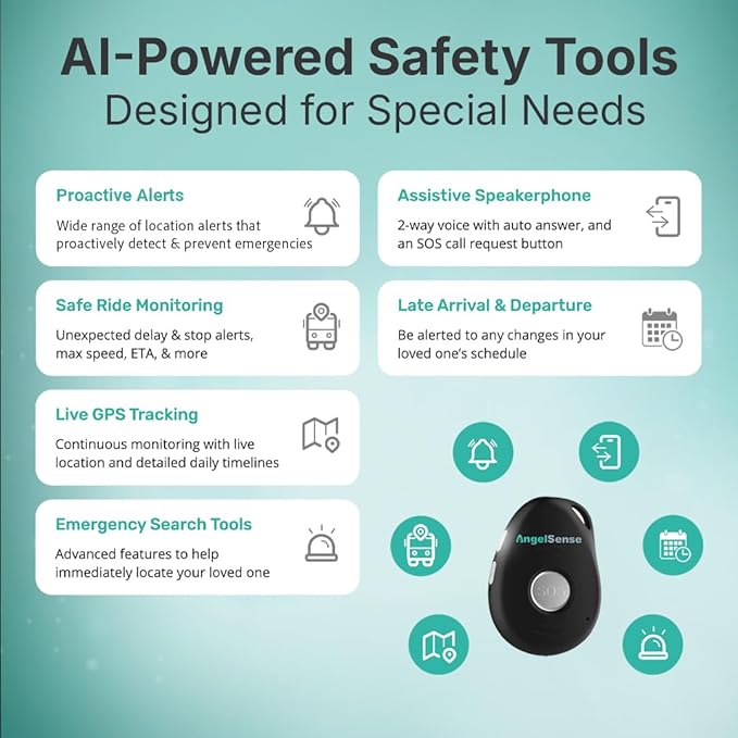 • INTELLIGENT ALERTS: Only AngelSense Auto-Learns daily routine for alerts when potentially dangerous situations occur: Early Departure, Unexpected Places, Late Arrival, Late Departure | SAFE RIDE MONITORING: Live Route, Max Speed, ETA, Unexpected Delays & Stops, Know if they miss the bus, get off at the wrong stop, the bus breaks down, or got off the bus but didn’t go into school. Standard GPS devices only provide alerts for preset geofences, we monitor your loved one anywhere & everywhere!