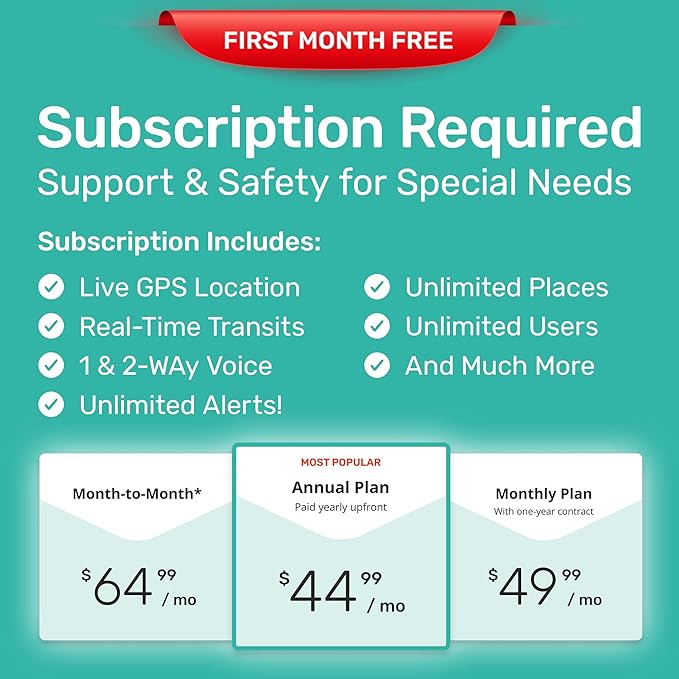 • FREE SERVICE FOR 1st MONTH with easy activation | MONTHLY SUBSCRIPTION REQUIRED: 49.99 per month with a 1-year contract & includes SIM card, Unlimited Live Tracking, Assistive Speakerphone with 60 Voice Mins per month, Intelligent Alerts, Premium Safety Features, Unlimited Live US Customer Care, & more | KIT INCLUDES: AngelSense GPS Device with Speakerphone, Soft Protective Sleeve, 3 Non-Removable Fasteners, Parent Key