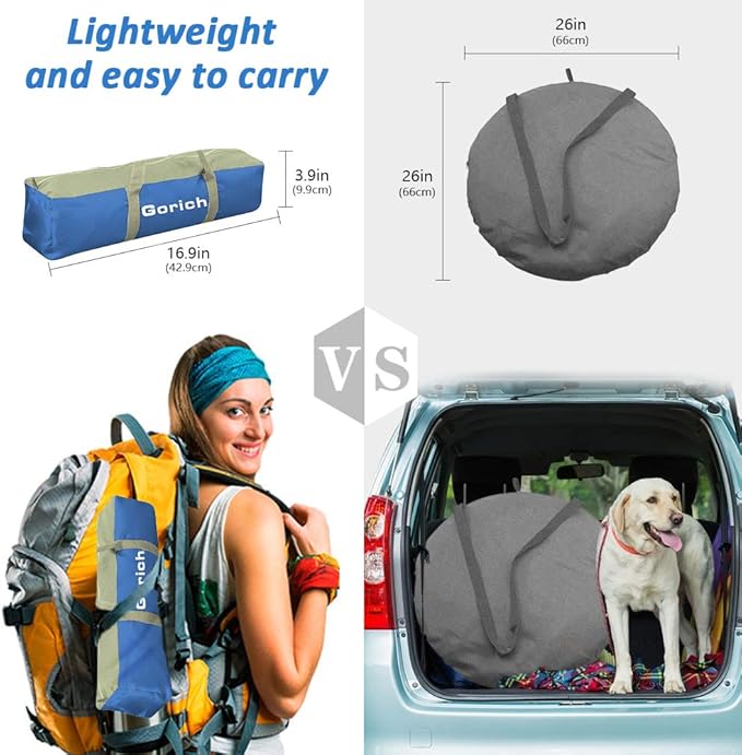 • Easy Set Up & Carry: Setting up fast within minutes. Gorich beach tent is much easier to fold than any kind of beach tents. It could fold down to a travel size of 17"H x 4"L x 4"W, weight 3.5 lbs, with a campact carrying bag that you even won’t notice it on your backpacks, much easy to carry