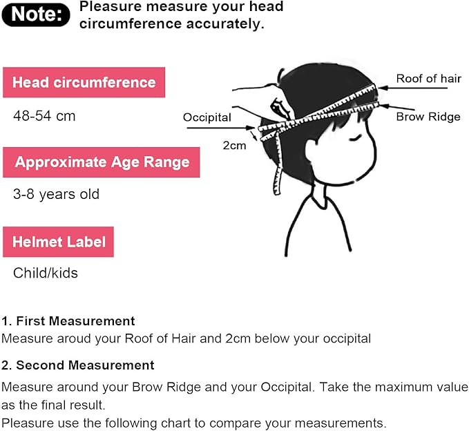 • [Kids Helmet] It is suitable for kids aged 3–8 years. The helmet size is 48–54 cm/18.9– 21.3 inches and easily adjustable for a snug fit; it could grow with your child for a few years