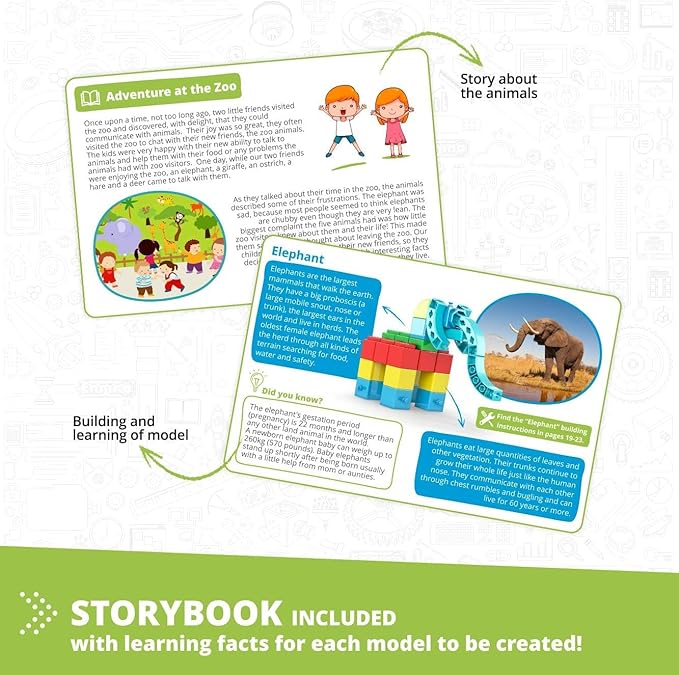 • STORYBOOK & ACTIVITIES: Includes a storybook with learning facts for each model to be created. Activities include challenges on creativity, spatial coordination and math. Introduce the fundamentals of engineering and STEM.
