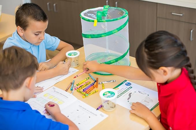 • Included: 2 cups of caterpillars along with their food, a reusable 12-inch-tall mesh habitat, 2 Chrys-A-Lid holders, a Flower-shaped Feeder, sugar packets for nectar, STEM Activity Journal, Instruction Guide, and dropper.