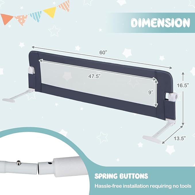 • Protect Your Baby's Safety: These 2 pack extra-long bed rails are 59 inches long each for added safety. Also When your kids sleep alone at night, they can provide them with the best protection and safe sleeping environment. They are your kid's safety guard, so you don't have to worry about your baby falling off the bed.