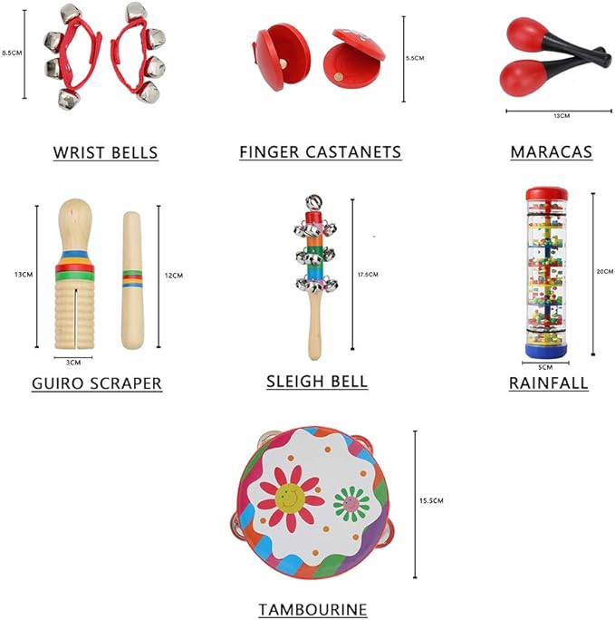 • Musical Instruments Toys Set: Percussion instruments set comes with 8 types 12 pcs colorful instruments: Wrist Bells, Finger Castanets, Maracas, Rainmaker, Tambourine, Guiro Scraper, Sleigh Bell and Storage bag