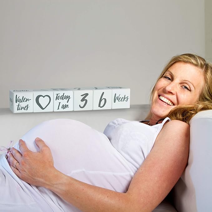 • A set of 6 solid wood printed with large numbers 0-9, 8 significant milestones, 5 popular holidays, 7 growth measurement classifiers; Days, Weeks, Months, Years, Lbs, Inches, Grade, and emoji lovely graphics. Includes cute sayings; Today I am 8 Months, My first Smile, My first Christmas, and more. Possible to make number combinations of age range from birth to adult. Awesome for weekly pregnancy countdown or tracking baby's important milestone. Each cube is 2.4 x 2.4 x 2.4 inches.
