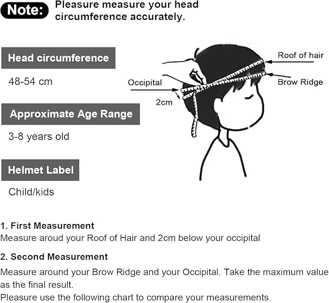 • Kids helmet: Suitable for 3-8 years old kids and toddlers with helmet size: 48-54 cm / 18.9-21.3". This kids bike helmet is easily adjustable for a snug fit, it could grow with your child for few years.
