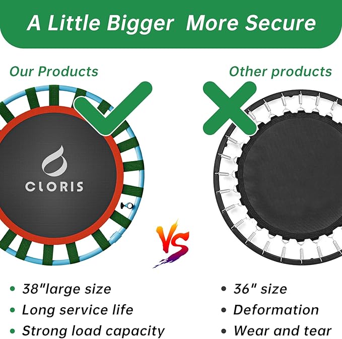 • 【EASY TO PUT TOGETHER】This elastic band trampoline requires little setup as it comes with the bands installed and adequately looped around the frame when you purchase them. To make the easy assembly easier, we also make a demo video to provide exact and step by step instructions, making sure that you get to enjoy our product sooner rather than later