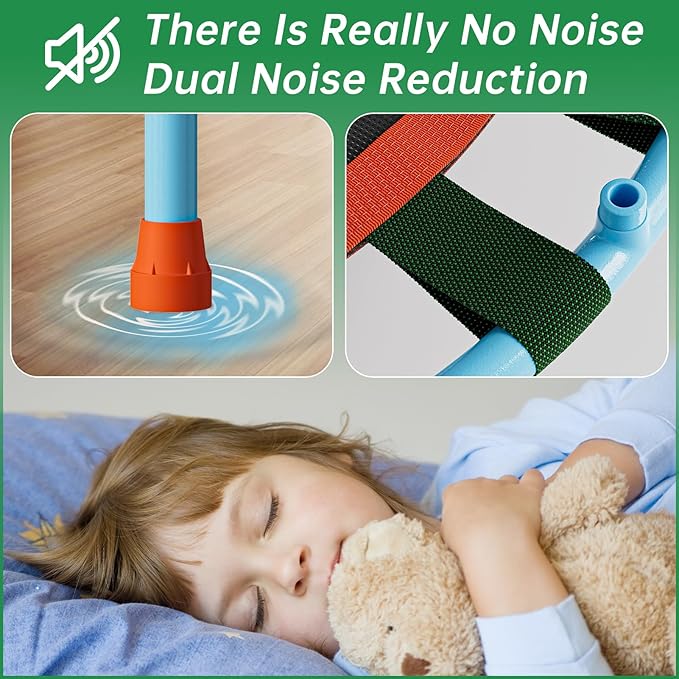 • 【SAFE AND FUN】 The padded handlebar is adjustable from 32.6” to 40.5” which fits your kid’s height perfectly. Kids can use the handlebar for easy grip to control their bounce. This springless trampoline is safer than the spring rebounders, primarily due to more soft parts. There is less of a chance of experiencing pinched fingers or toes, regardless of the safety precautions in place. Moreover, this trampoline has been added with a covering on top of the bands to provide safer jump pad surface