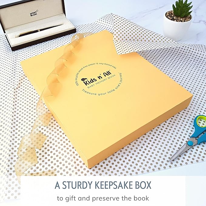 • EXQUISITE HEIRLOOM, made with the RESPONSIBLY SOURCED FINEST materials: Kids N' All baby milestone book is made from ARCHIVAL GRADE, 100% RECYCLED FSC (Forest Stewardship Council) PAPER to reduce the impact on our planet. The THICK 200GSM WOOD-FREE PAGES mean you can confidently use an ultra fine-tip sharpie with NO BLEEDS. The FSC label ensures the responsible use of the world’s forest resources. By choosing our baby scrapbook album, you help keep forests better for your future generations.