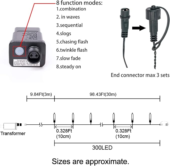 • ·Quite Long Enough Light String - The total length of the light string is 108.27 ft, which contains 300 bright LED bulbs, and can be connected end to end, and up to 3 groups of the same light string can be connected