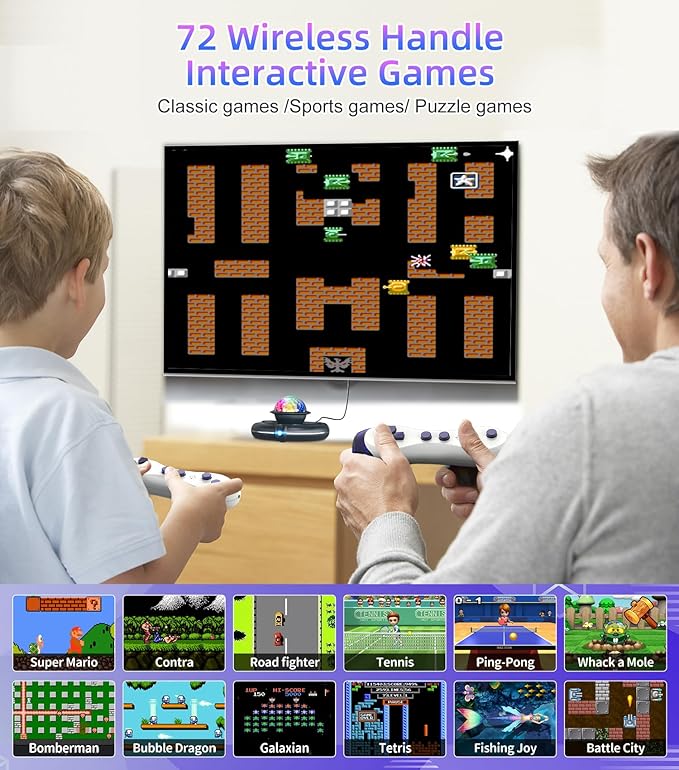 • PLUG AND PLAY : Enjoy offline play instantlyβ€”no internet or Wi-Fi needed! Simply connect via HDMI to your TV/ PC/ projector in ​just 5 minutes. Upgraded IC chip delivers ultra-smooth 4K visuals. The built-in 9 AR camera games, smart camera captures your every move, rendering your figure in real-time on the screen for an immersive experience. The disco ball lights create instant club vibes. Host epic kids’ birthday battles or family game nights effortlessly. Plus, two wireless controllers let you play solo or battle it out with friends!