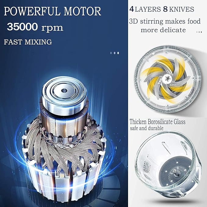 • Baby Food Blender-- Made of BPA free material and borosilicate glass, food grade stainless steel, safe for food contact. 300ml cup capacity, moderate and no waste