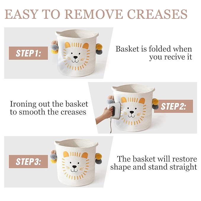 • CUTE EMBROIDERY - Bring a delightful charm to any kids' room with this stylish storage bin featuring a cute embroidered lion pattern design. Not only does it add a playful touch, but it also provides effective storage for various items. The versatility of this container extends beyond the kids' room, as it can be used in the living room, bedroom, bathroom, and more, seamlessly blending with any decor. This package includes 1 cotton rope basket