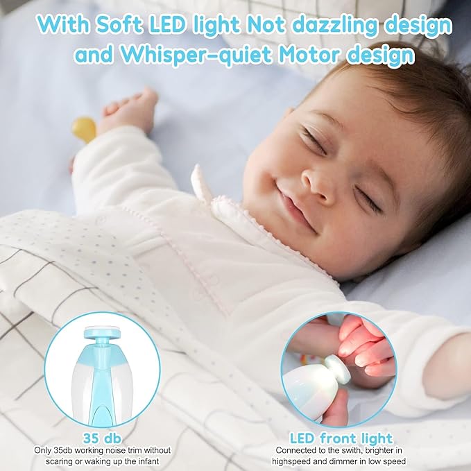 • Low Noise: Baby electric nail trimmer is equipped with a whisper-quiet motor. Only 35dB operating sound. You can file nails even as the baby sleeps, without causing any disturbance. You can use it in the dark at night