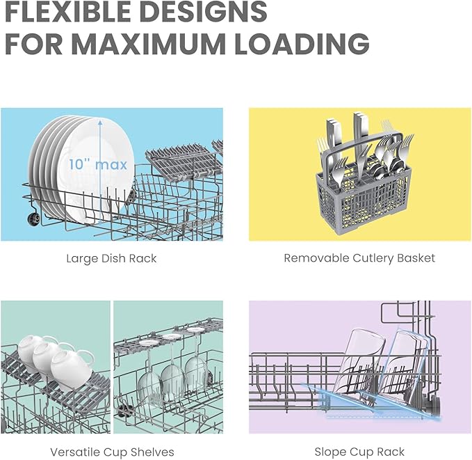 • Speed Program- Only takes you 45 minutes to get all dishes cleaned, perfect for hurry-up situations, like holding a multi-round party. Accompanied with compliant, water consumption can be as low as 2.77 gallons of water, which greatly saves your costs.