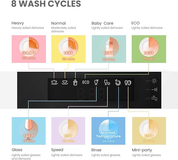 • 8 Washing Cycles- Most of the cleaning cycles, including Heavy, Normal, Baby-Care, ECO, Glass, and Speed, helped with extra-drying function, and deliver sparklingly cleaned and dried dishes. Three more cleaning options, including Speed, Mini-party, and Rinse, are designed for COMFEE' compact dishwasher, providing high flexibility for you to choose in different situations.