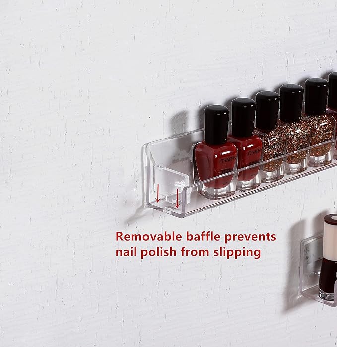 • ANTI FALLING BAFFLE:Designed with 2 removable stop inserts on the nail polish rack ends to keep bottles from falling out the sides of acrylic shelf