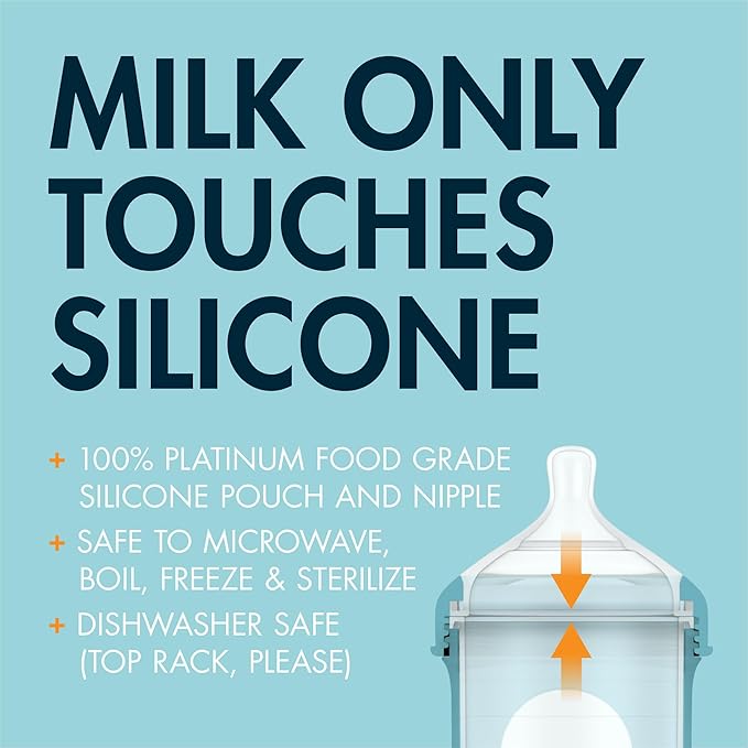 • Safety of Silicone: The only thing your baby's milk comes in contact with is the 100% food-safe silicone of the nipple and pouch; made without BPA or PVC