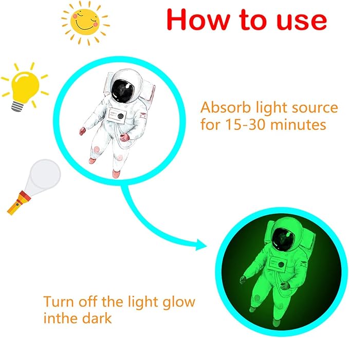 • EASY TO USE - The stickers need to absorb light before they emit light. You only need to put them in a flashlight or sunlight for 15 to 30 minutes, then turn off the light you will see a magic starry sky view on your eyes. The longer the light absorption time, the longer the lighting time.