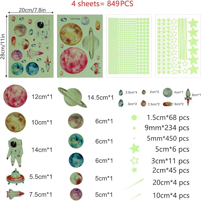• What You Will Get - These glow in the dark stickers have 849 PCS, including planets, rockets, astronauts, meteorites, stars, dots, multiple styles you can match them in any combination to create your own starry sky.