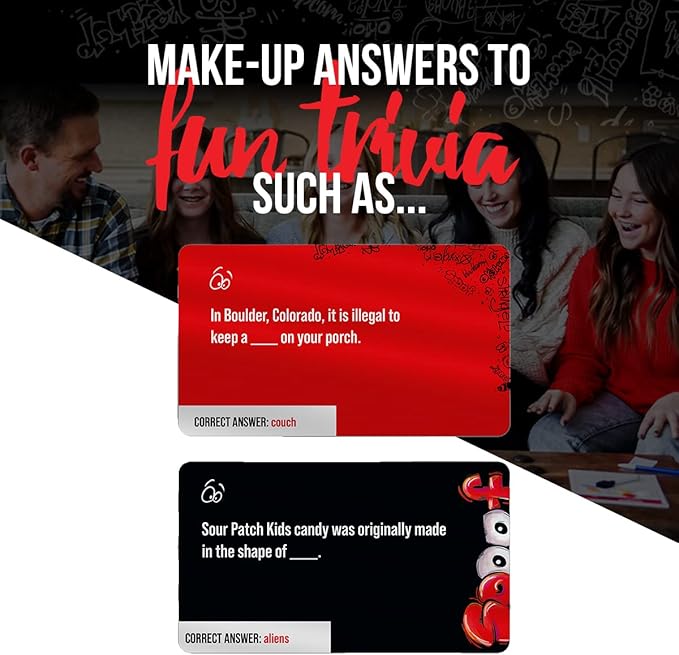 • Be Creative & Fool Your Friends: "Spoof" your friends by making up clever, fake answers to fun trivia such as "_______ is the national bird of Japan." "_______ is illegal to have on your porch in Arizona." Be careful with the correct answers!