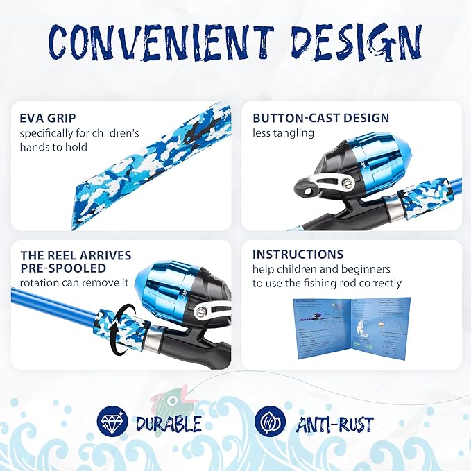 • THE SUITABLE PRESENT FOR CHILDREN: The youth fishing pole is suitable for children over 3 years old. It is a great present for birthdays, Children's Day, and Christmas. Please follow the instructions, if you have any questions, please tell us for a satisfactory solution. Tips: Tighten the fishing line when collecting the fishing rod to avoid entanglement of the fishing line