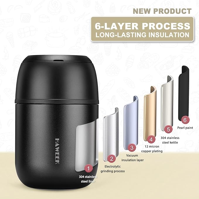 • 【Easy to Open】2 in 1 insulated food jar with a folding spoon, 1 user manual. Notice: Pour in hot & cold water to preheat & pre-cool for 5~10 minutes before packing food.