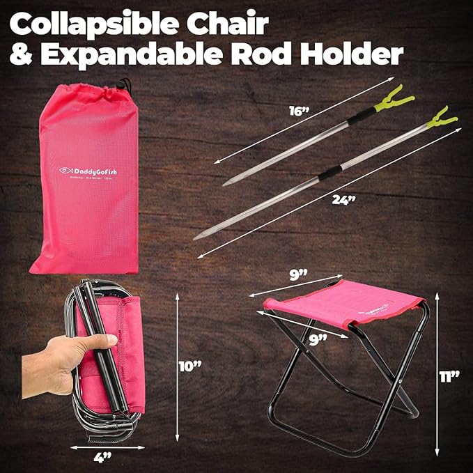 • COLLAPSIBLE CHAIR AND ROD HOLDER - Kids have a place to rest wherever they go. The rod holder keeps the fishing pole off the ground and minimizes the chance of accidental damage.
