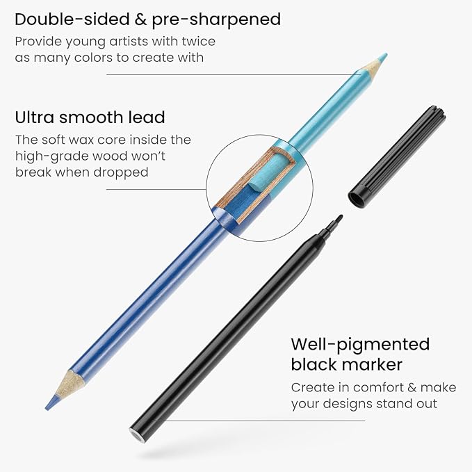 • Set Includes 12 Double-Ended Colored Pencils: Our coloring book set also included colored pencils for kids, one pencil sharpener, one eraser, and one black marker.