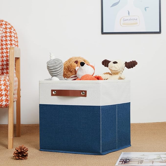 • 【Sturdy Leather Handles 】Sturdy thickened leather handles and metal iron buckles make them easy to carry even with a heavy load. Cardboard is inserted at the bottom and sides to provide support, so that these decorativecube storage bin to stand on, holding the shape well and can be used for a long time