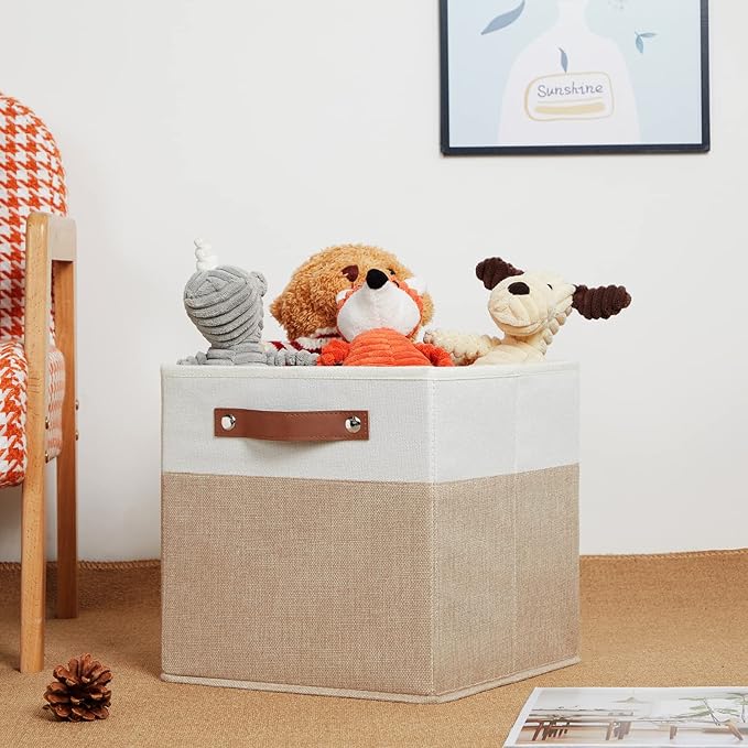 • 【Sturdy Leather Handles 】Sturdy thickened leather handles and metal iron buckles make them easy to carry even with a heavy load. Cardboard is inserted at the bottom and sides to provide support, so that these decorativecube storage bin to stand on, holding the shape well and can be used for a long time