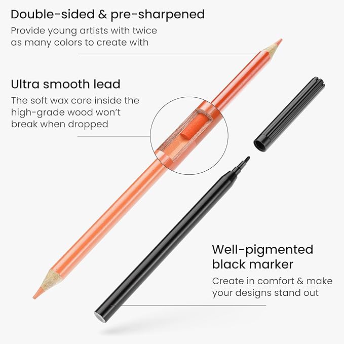 • Set Includes 12 Double-Ended Colored Pencils: Our doodle book also includes colored pencils for kids, one pencil sharpener, one eraser, and one black marker.